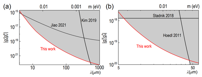 Imagen: las partes izquierda y derecha son nuevas restricciones en dos tipos de interacciones exóticas dependientes del espín, además de los límites establecidos por experimentos anteriores. La línea roja es el límite superior establecido por nuestro experimento.