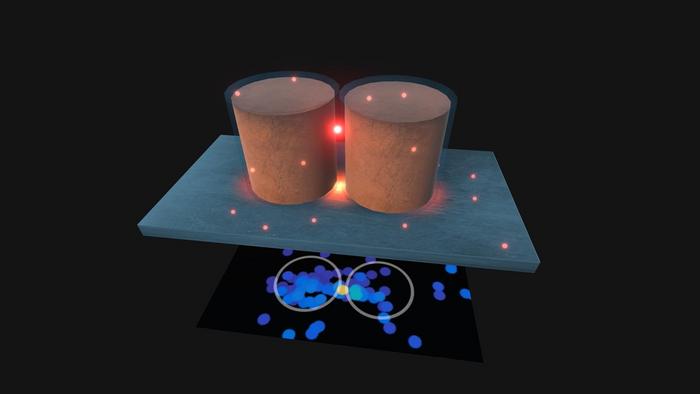 La interacción entre moléculas individuales y una nanoantena de fosfuro de galio se mide gracias a la microscopía de imágenes de fluorescencia de por vida de una sola molécula (smFLIM). Esta técnica proporciona información espacio-temporal a nanoescala sobre la tasa de desintegración radiativa de moléculas fluorescentes individuales en el campo cercano de la nanoantena y resalta el potencial de los materiales dieléctricos en la nanofotónica. En la figura se muestra una vista artística de la muestra, que representa un punto crítico con buena densidad en la brecha. La antena está resaltada con moléculas fluorescentes. La tasa de desintegración de cada molécula emisora se mide junto con su posición ultraprecisa. Debajo de la estructura se muestra un mapa de súper resolución de la tasa de desintegración radiactiva. Las moléculas en la brecha (punto amarillo) experimentan un aumento de 30 veces en la tasa de desintegración radiactiva.