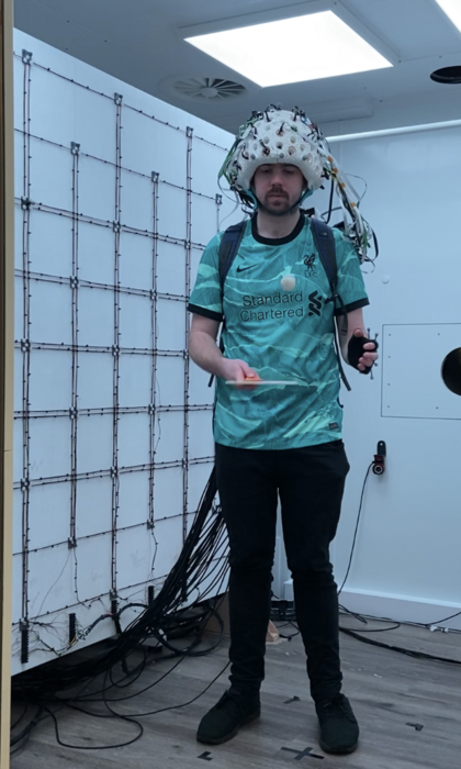 Foto: El investigador Niall Holmes con un casco de imágenes cerebrales de pie