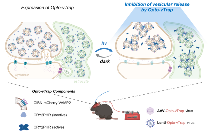 Para controlar directamente las vesículas extracelulares, el equipo de investigación aplicó una técnica que desarrollaron previamente en 2014, llamada inhibición inversa fotoactivada por trampa combinada (LARIAT). Esta plataforma puede inactivar diferentes tipos de proteínas cuando se ilumina con luz azul atrapando inmediatamente las proteínas objetivo, como el lariat. Opto-vTrap se desarrolló aplicando la plataforma LARIAT a la secreción de vesículas. Cuando las células o tejidos que expresan Opto-vTrap se destacan bajo luz azul, las vesículas se agrupan y quedan atrapadas dentro de las células, lo que evita la liberación de transmisores.