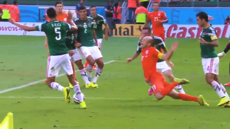 Arjen Robben recibió una falta controvertida en el área penal, luego Holanda anotó un tiro penal.