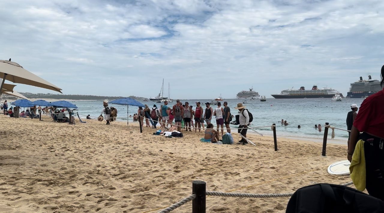 Afortunadamente, pudimos detenernos en Cabo San Lucas, donde estaba nublado pero aún hacía suficiente calor como para atraer a miles de personas a la playa.