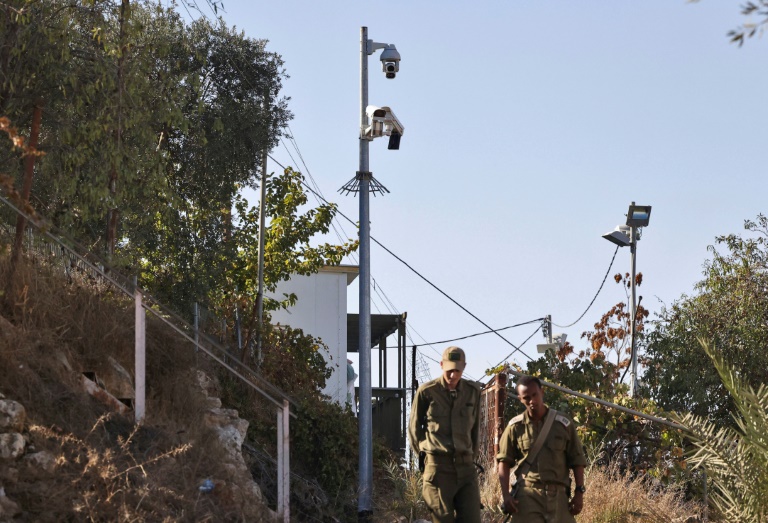 En esta foto de archivo tomada el 9 de noviembre de 2021, soldados israelíes pasan frente a cámaras de vigilancia en la ciudad palestina de Hebrón. © AFP / Archivo / Hazem Bader